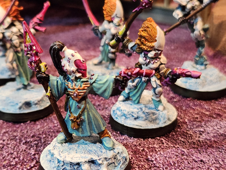 After finishing the slice, I had a little extra time and decided to paint the Banshees and Warlock I have been using for our FLGS crusade matches. The banshees are a hodgepodge; three of them are 2nd edition, but two are 3rd edition and there is also a mix of blades and weapons. I picked these up cheap in an eBay rescue lot a while ago; all of them were missing arms and required some minor greenstuff work to get assembled. Don’t look too closely – at least one has a right hand on her left side!