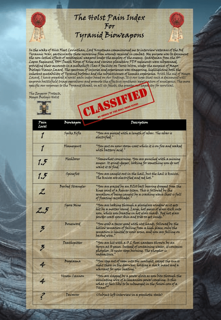 The sting reminded me of my own experiences with a swarm of paper wasps a few months ago, the effects of which I am still recovering from. The Schmidt Pain Index is a hilarious/disturbing document that describes what it is like to be stung by a number of insects. I felt quite validated reading the entry in the pain index for the wasps that stung me: “Burning, throbbing and lonely. A single drop of superheated frying oil landed on your arm.” With this as inspiration, I wrote “The Holst Pain Index for Tyranid Bioweapons”. Enjoy!