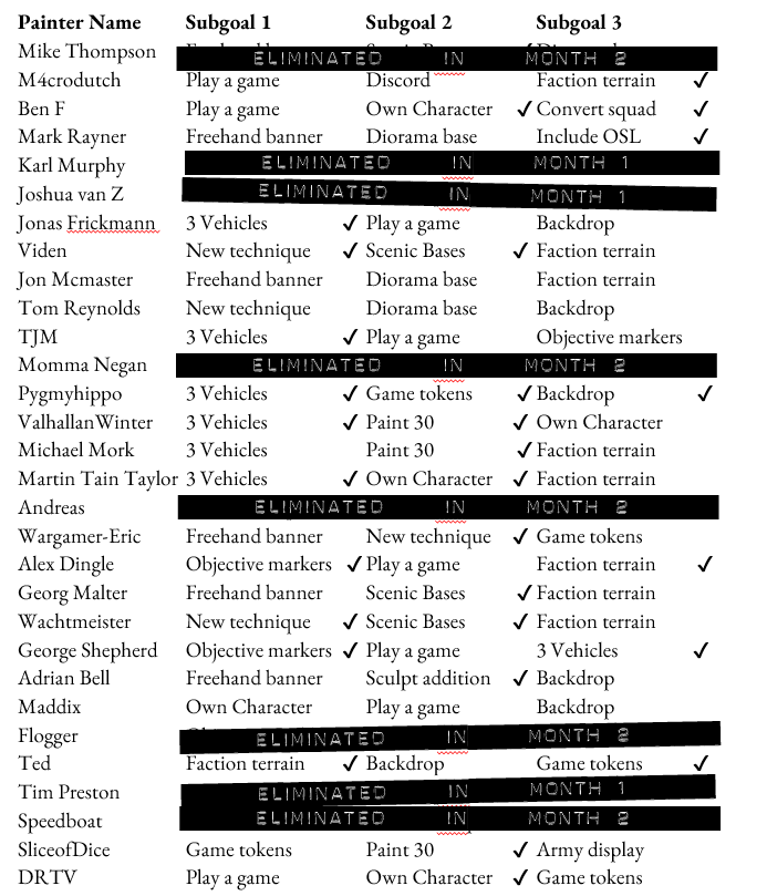 This month we are going to look a bit at the subgoals first. To sucessfully complete the challenge, each participant will have to complete 3 subgoals selected from a list specific to either Painter’s or Gamer’s entries or the common list. The current status can be seen in the table below: