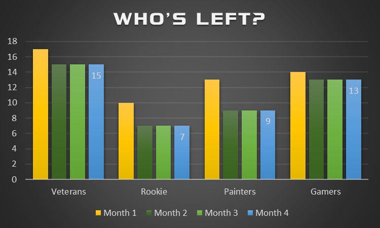Again this month (third consecutive) we did not lose any participants. It tells me, that the people who are in it now are likely to succeed. We have seen this “weeding” in the other challenges as well, where people drop off in month 1 and 2 irrespective of mulligans, the actual pledge or the amount of models. I would say it is about two thing: planning and motivation.