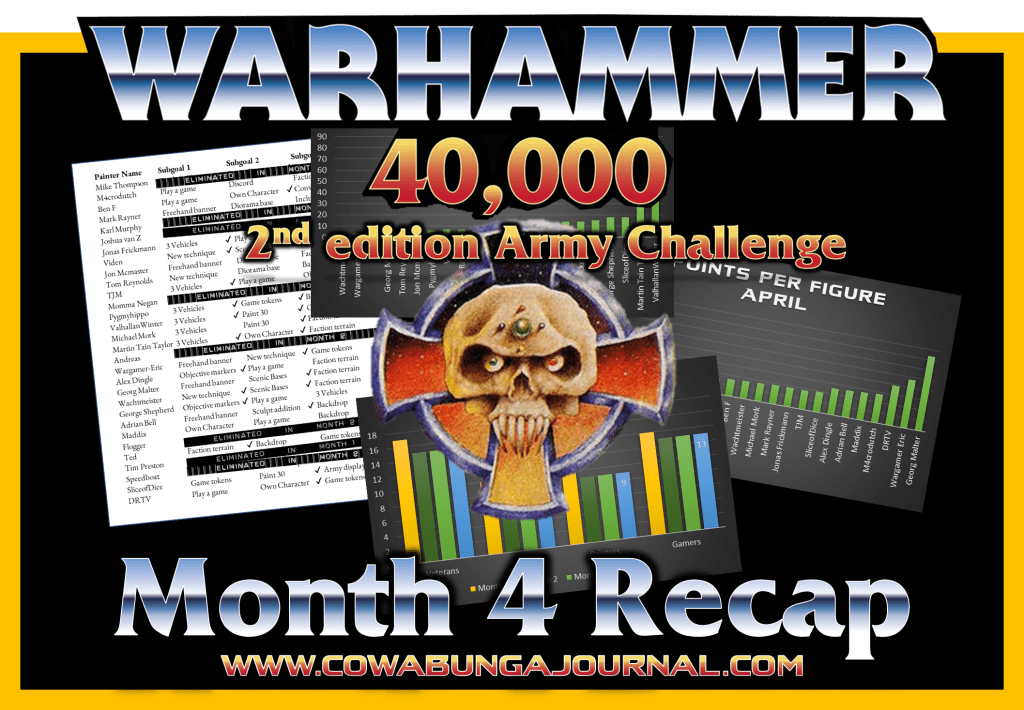 Looking at April, Georg Malter has outdone everyone else, by getting in as many points possible for as few figures possible. Conversely, Valhallan Winter wins the round on getting the least for his efforts with 80 guardsmen painted in one round. Curiously, we have two newcomers to the cheap end of the spectrum. This is of course Tom and Ted who both painted a rhino this month. A rhino constitutes the equivalent of 4 figures in this balance, and only costs 50 points. This is highly likely the only time we will see either of these guys below 20 PPF.