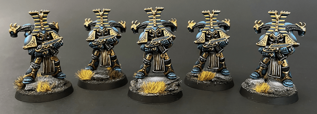 Hello! Finished this month are 5 tall handsome monopose Thousand Sons. These were an ebay lot bought many moons ago which would definitely be too pricey for my cheap ass to pick up now. Great sculpts that fit in fine with modern minis in terms of style and size – GW hasn’t diverged too far from this design to this day. The plastic backpacks do leave something to be desired in terms of details though.