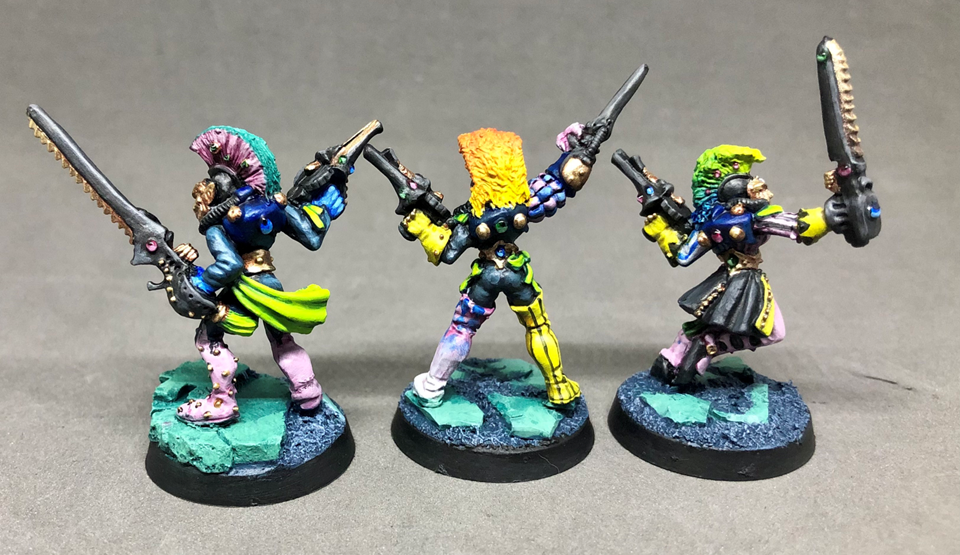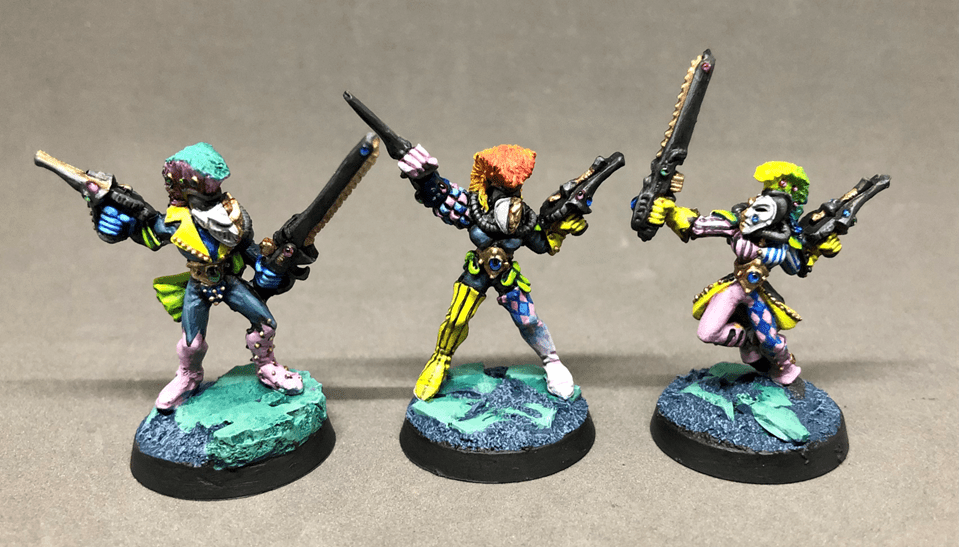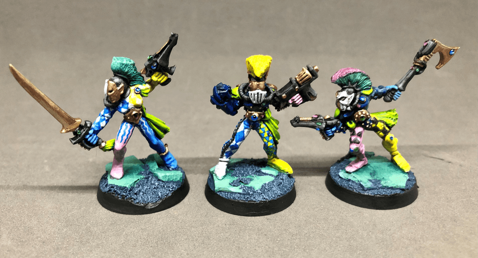 This month sees the last ‘squad’ of Harlequin Troupers finished off. I haven’t really played around with blending on these models overly much so I wanted to get a bit more blending of colours in the hair of this squad. I also came across some cool images of someone else’s Harlequins (no idea who unfortunately) and they had two tones for the hair with no blending, just the top layer as a different colour.