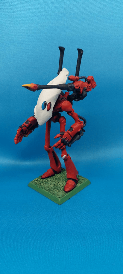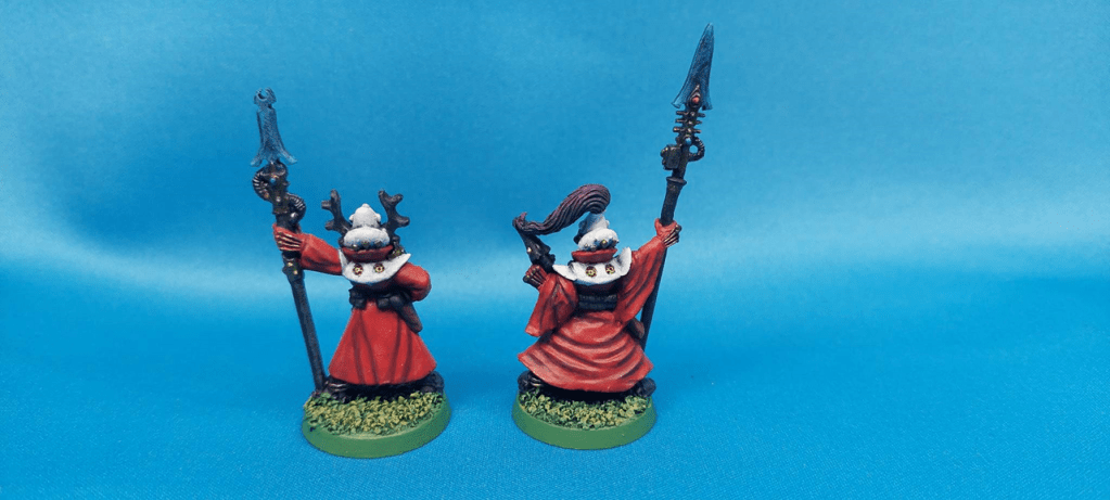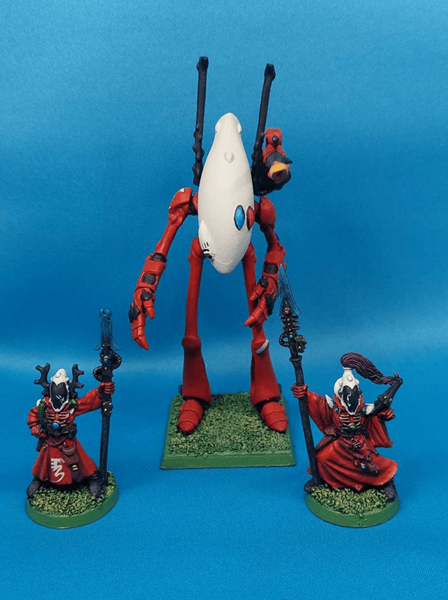 The 2 Warlocks (like the others) are great sculpts to work with. Though for once I found myself without a lot of reference photos on how I should go about doing them. The codex doesn’t have any painted examples in the colour pages other than a couple hidden away in the larger army photos. I decided to keep them matching the Saim-Hann army theme with red and a white helmet. I had recently been painting up some Necromunda Redemptionists so this felt right at home :). The one Warlock had a nice flat cloth in the front so I was able to try some more freehand by putting the Saim-Hann logo on there, which I was pleased with. The other one had too many folds on his robes which would make it more difficult to pull off, and I didn’t think my skills were up to that.