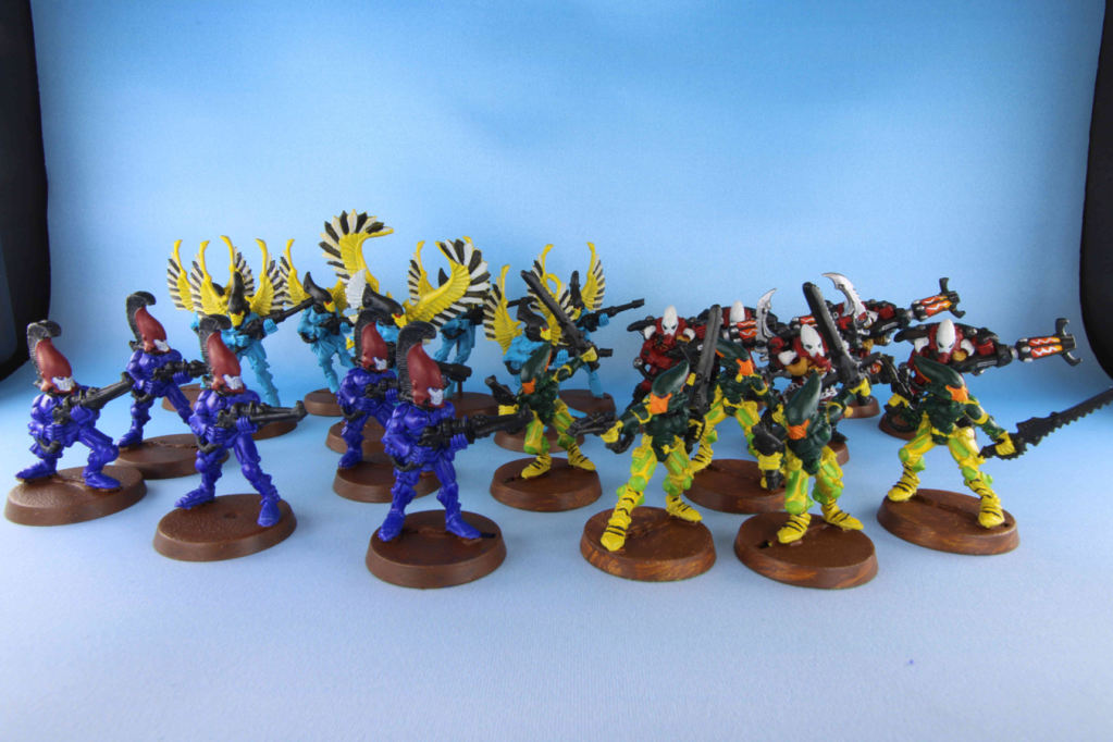 In my case for this month, Dire Avengers do well holding objectives towards the middle of the battlefield, Striking Scorpions are tough melee fighters that can get the jump on attrition battles against horde units, Swooping Hawks can harass targets of opportunity along the edge of the battle, and Warp Spiders can hit-and-run in the middle of the board by dodging around corners while hitting targets that felt safe.