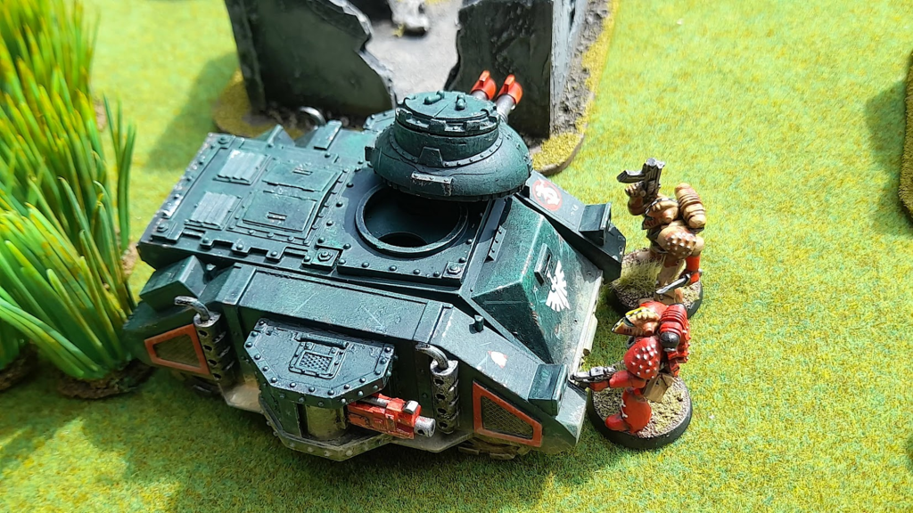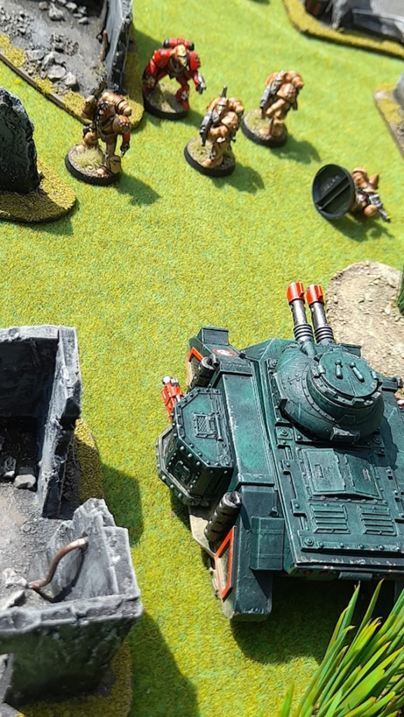 As the other side of the battlefield, the predator had been hammering the Blood Angels hiding between the rocks. It had not been that successful however, and the Blood Angels did not feel discouraged. A sneakily hid squad wearing campaign camouflage snuck up on the tank…