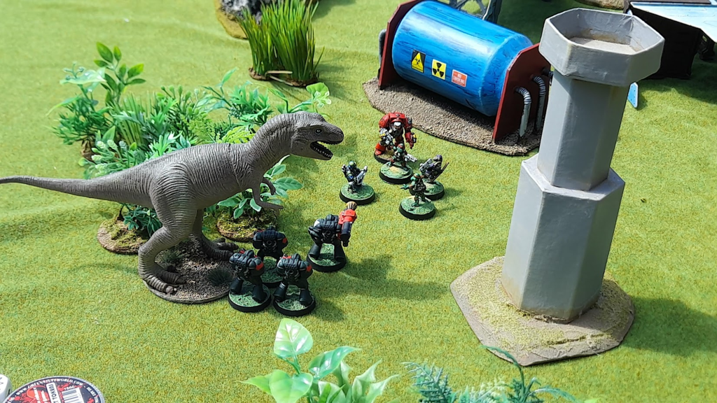 Suddenly, when it was least called for, a mighty Carnosaur came running in from the jungle (random monsters are a thing in the campaign), toppling the remaining Dark Angel tacticals. The carnosaur kills most things it touches and moves a full 2d6 in the direction (and through) of the nearest model to it. Deadly!