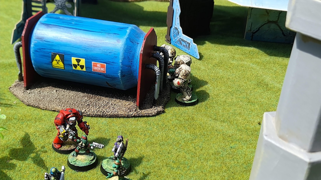 In the scenario, two reactors must be placed on the centre line as the objectives. The scenario is quite assymetric, in that one side (the “evil” side – or the misguided side perhaps, in our case) has a device that they want to place on one of the reactors to blow it up. One squad is secretly noted as having the device and basically has to get in contact with one of the reactors and stand around for a turn rigging it. If they succeed they win, otherwise the opponent wins. No VP or other.