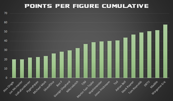 We might as well get it out of the way immediately: The much treasured PPF rating for the whole challenge can be seen above. No one beats Alex Dingle who is at 20.1 points per figure for the challenge. Jon is a close second with 20.2 PPF. Despite his insane amount of models Valhallan Winter did so many vehicles that his PPF is at 22.2. At the other end of the spectrum Wargamer Eric reigns supreme – we can call it the Eldar Aspect effect. Clocking in at 57.7 PPF he beats Maddix, Dr. The Viking and Tom Reynolds who are the runners up at ~50 PPF.