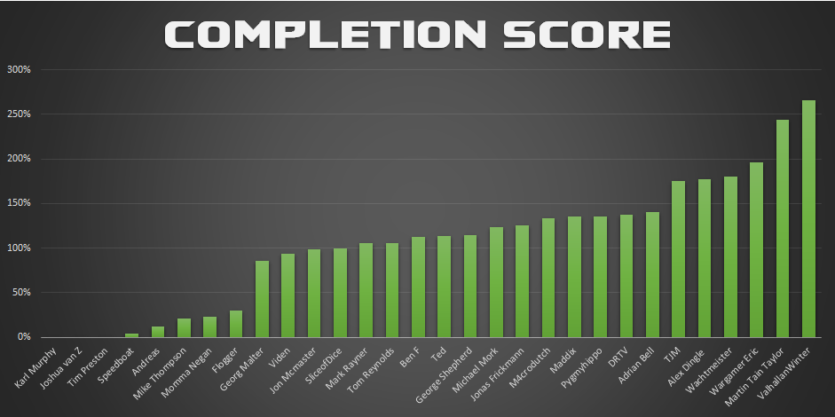My last stat here is the “completion score”. It is the average of models finished/models pledges and points finished/points pledged given in percentage. There is basically three ranges here. The first is those who did not make it. A few (Viden and Malter) came very close. The next looong stretch is those who made it, and more or less stuck to their pledge (with maybe a few extras). Then from TJM and onwards there is those who, percentage-wise, significantly increased their pledge with bonus models. Wargamer Eric is probably the odd man out here in that last category, because he started from a much lower pledge count.