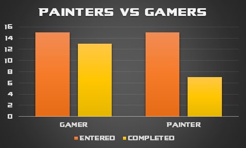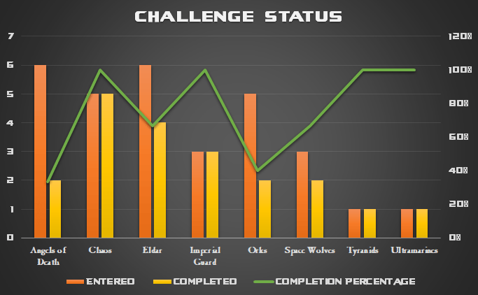 Parsing it out on the different codices it would seem that especially Angels of Death and Orks had a hard time going all the way in this challenge. Chaos, IG, Tyranids, and Ultras were 100%. You could also look at it from a Rookie vs veteran point of view.