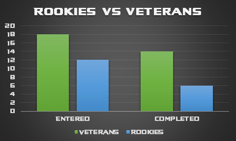 We dropped half of the rookied on the floor, while 80% of the veterans pulled through. I attribute this to the experience of the veterans. These people are less likely to be surprised about what this challenge requires. I hope to see some of the rookies back in the future, despite having failed this time around.