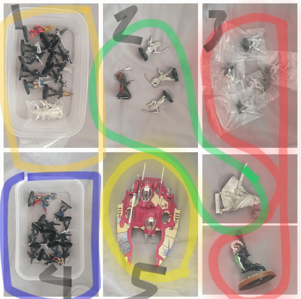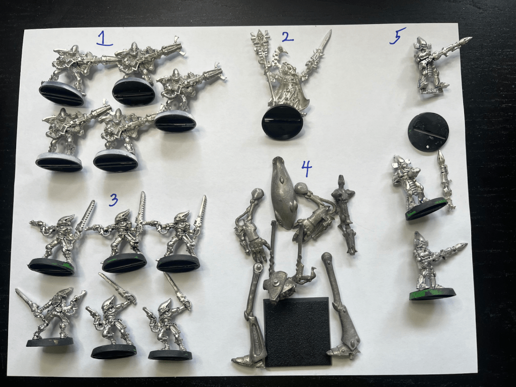 I’ve set a painting challenge to tackle one squad or character each month, aiming for classic schemes: Alaitoc where applicable, with colors like black, white, red, green, yellow, blue, and navy.