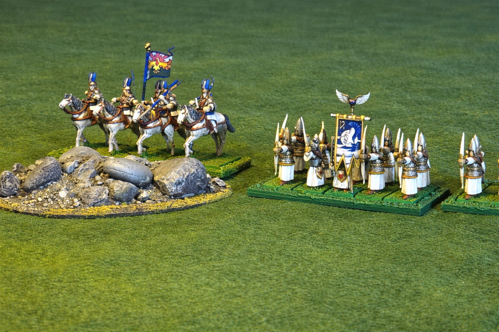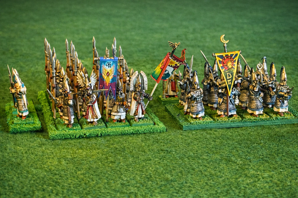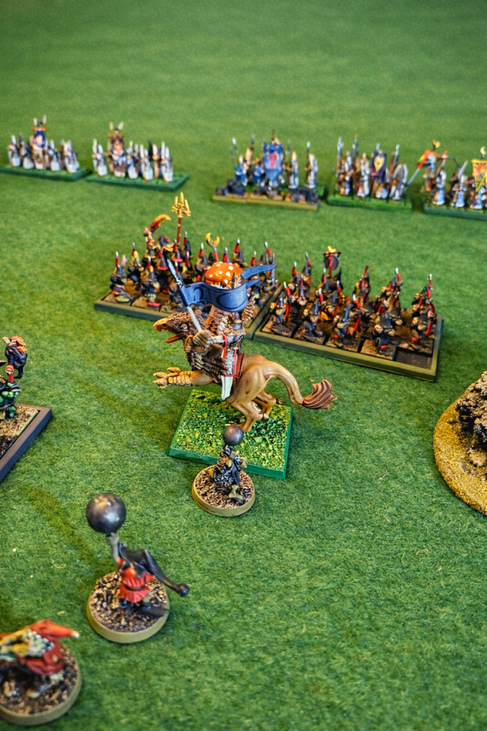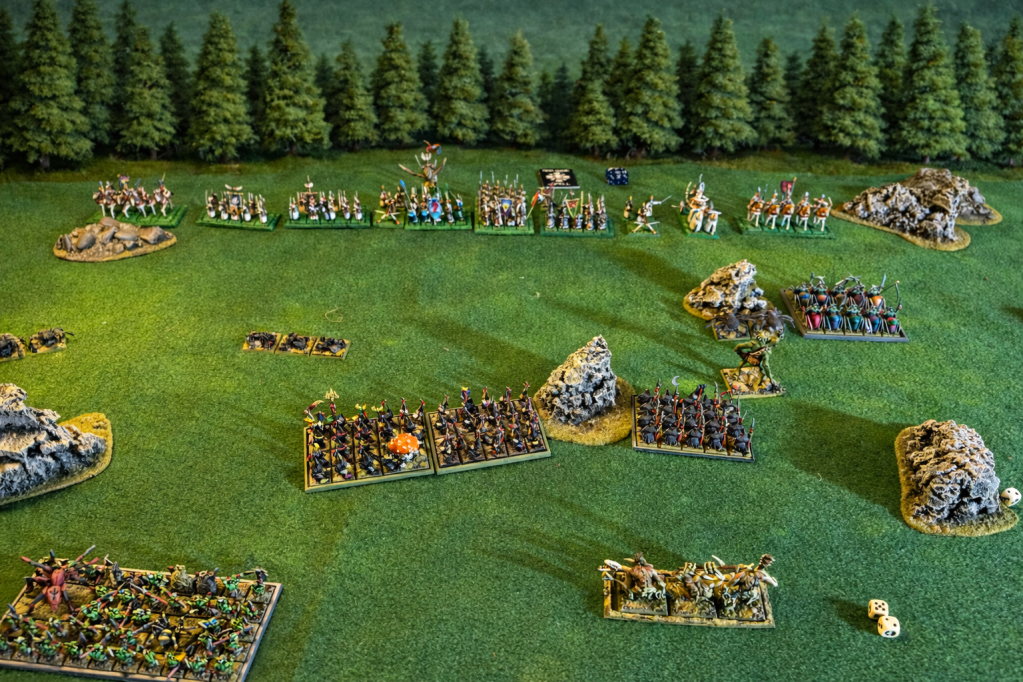 The High Elves arrived with a precise and disciplined force. Bolt throwers and archers formed a solid firing line, infantry blocks waited to counter-charge, and fast elements hovered on the flanks. A griffon-mounted hero loomed as a potential terror weapon, ready to strike where goblin nerve might fail. It was an army built to control the pace of the game.