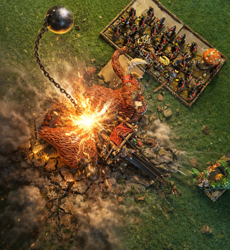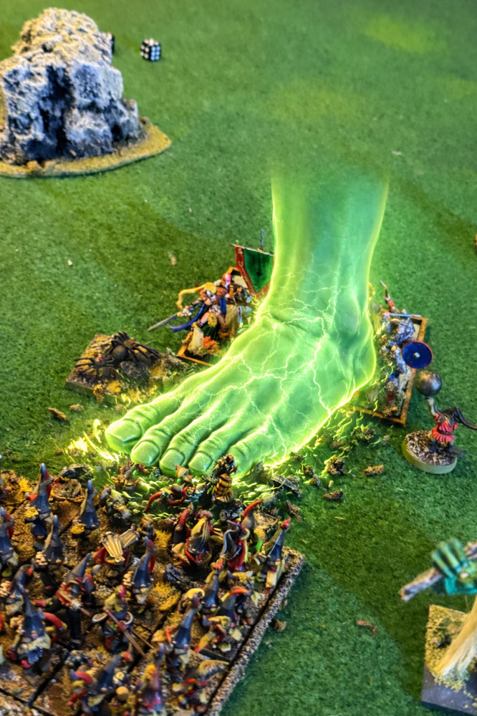 Elsewhere, the Night Goblin shaman Sniggleguts called down the Foot of Gork, aiming to crush the advancing huscarls. The god missed entirely, instead flattening a group of spider swarms while the huscarls continued unharmed.