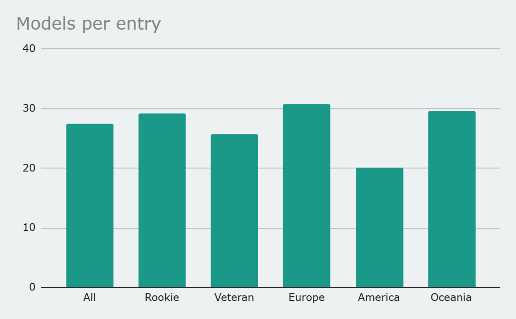 Looking at the stats we see that there is actually a but of difference between the continents. Modelwise, the Europeans are slightly more ambitious, while the Americans fall a bit behind the rest. In Oceania they like the middle ground. The veterans seem to have used their experience and only pledged the needed miniatures, whilst the rookies (anyone with 0 or 1 completed challenges in the boot) have pledged a few more models.