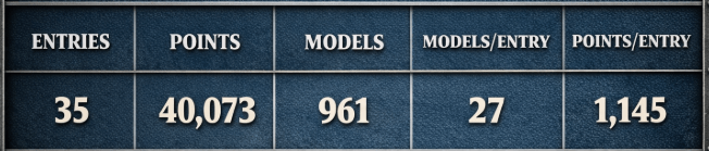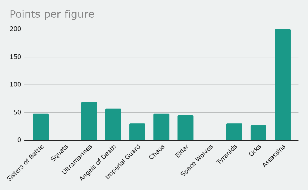 As we turn our heads to the highly coveted and acclaimed Points Per Figure (pints per figure to the British audience) we can instantly see what skewers the American effort. It is indeed glaringly obvious that the sole entry of an Assassins based army is tampering with all the stats. At 200 points per figure they are breaking all records.