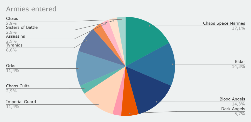 Lastly, looking at the distributions of armies and codexes used, we actually see most Chaos armies this year. It is a strong army, and one that has a great potential and complete freedom in many aspects so it is little wonder that it is popular.
