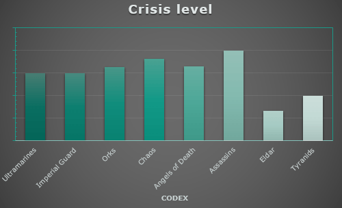 Crisis levels vary noticeably by codex, with Assassins standing out at the top as the most unstable group, followed by Chaos and Orks sitting consistently above the midpoint. Ultramarines and Imperial Guard land in a more controlled middle range, while Angels of Death remain slightly elevated but not extreme. At the opposite end, Eldar show the lowest crisis levels by a clear margin, with Tyranids also relatively stable. This is surprising!