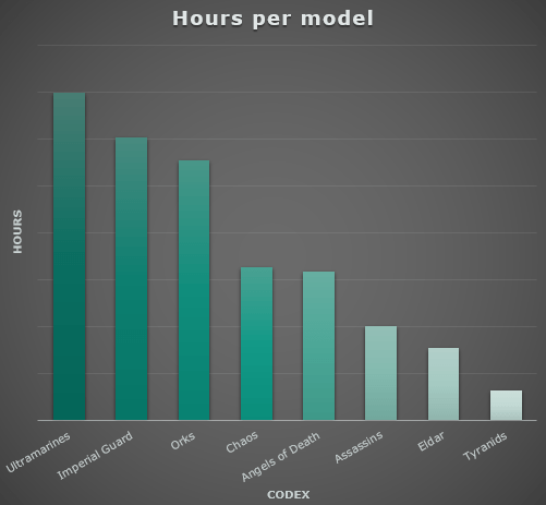 There is a clear spread in time investment per model across codexes, with Ultramarines and Imperial Guard sitting at the top, indicating a slow and deliberate approach where each model receives significant attention. Orks follow in a similar but slightly less extreme range, still leaning toward time intensive work. Chaos and Angels of Death occupy the middle ground with a more balanced pace, suggesting a mix of efficiency and detail. At the opposite end, Assassins, Eldar, and especially Tyranids show very low hours per model, pointing toward fast execution and a strong emphasis on throughput over individual model investment. Again, quite surprising to see Eldar at this end of the spectrum. It is probably heavily driven by TJM.