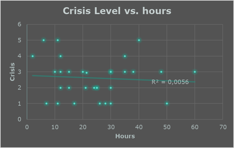 There is essentially no relationship between time invested and crisis level, with the trend line being almost completely flat and an R² of 0.0056 confirming that hours explain virtually none of the variation. Painters logging very high hours are just as likely to experience low crisis levels as those putting in minimal time, while several of the highest crisis scores appear in the mid to low hour range. This suggests that crises are not driven by workload but rather by individual approach, planning, or randomness, making crisis a behavioural metric rather than a consequence of effort.