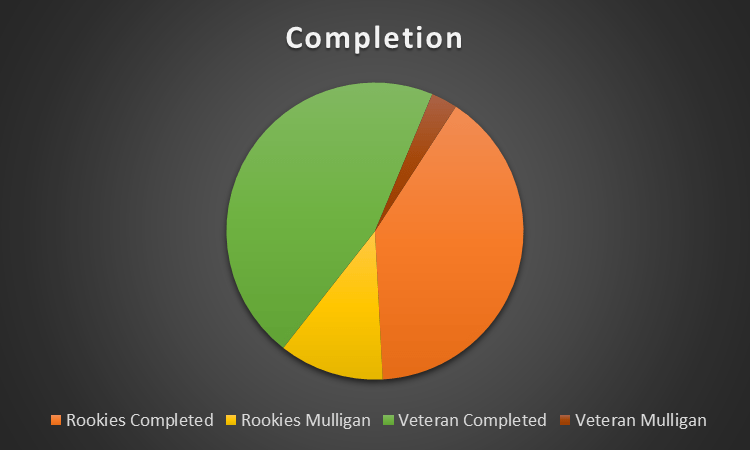Completion is dominated by successful outcomes across both groups, with veterans making up the largest share of completed entries, followed by a strong contribution from rookies. Mulligans remain a smaller portion overall, with rookies accounting for most of them while veteran mulligans are almost negligible. This suggests that experience is translating into consistency, while newer participants are still finding their footing.