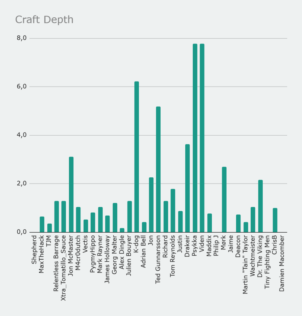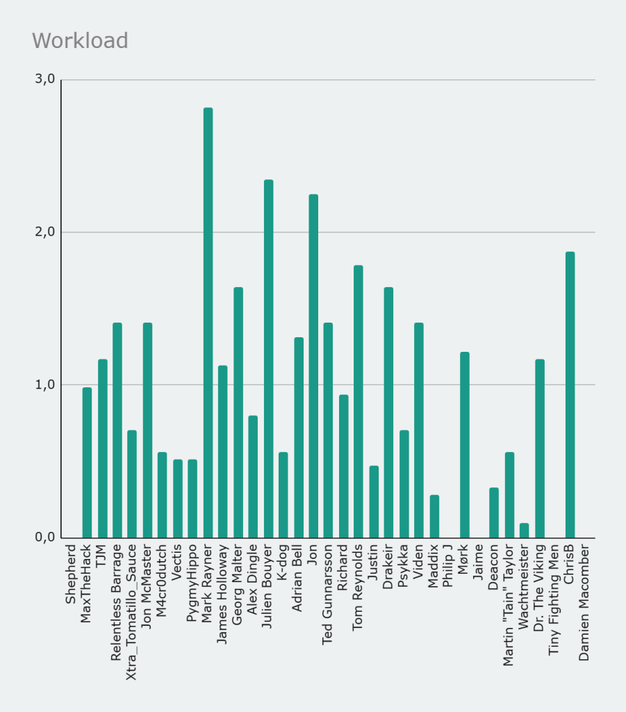 This is why the final distribution looks the way it does. Mark Rayner rises far above the field because he scores strongly across all three components, combining high hours with meaningful output and enough depth to avoid penalties. Jon and ChrisB follow as strong all rounders who perform well across the board but do not reach the same extreme. Julien Bouyer and Tom Reynolds also score highly by maintaining balance rather than relying on a single strength.