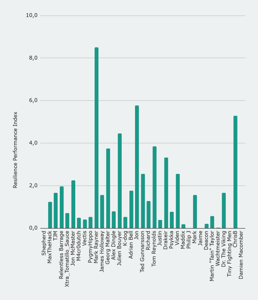 The Resilience Performance Index combines workload, output and craft depth into a single measure that rewards balance rather than specialization. It compares each painter to the field average across all three dimensions and then applies a scaling factor that favours sustained effort without letting extreme hours dominate completely. The result is that painters who perform well across the board rise sharply, while those relying on a single strength are heavily penalised. This creates a clear separation between complete all round performers and more one dimensional approaches, with the highest scores reflecting consistency across every aspect of the challenge rather than dominance in any single metric.