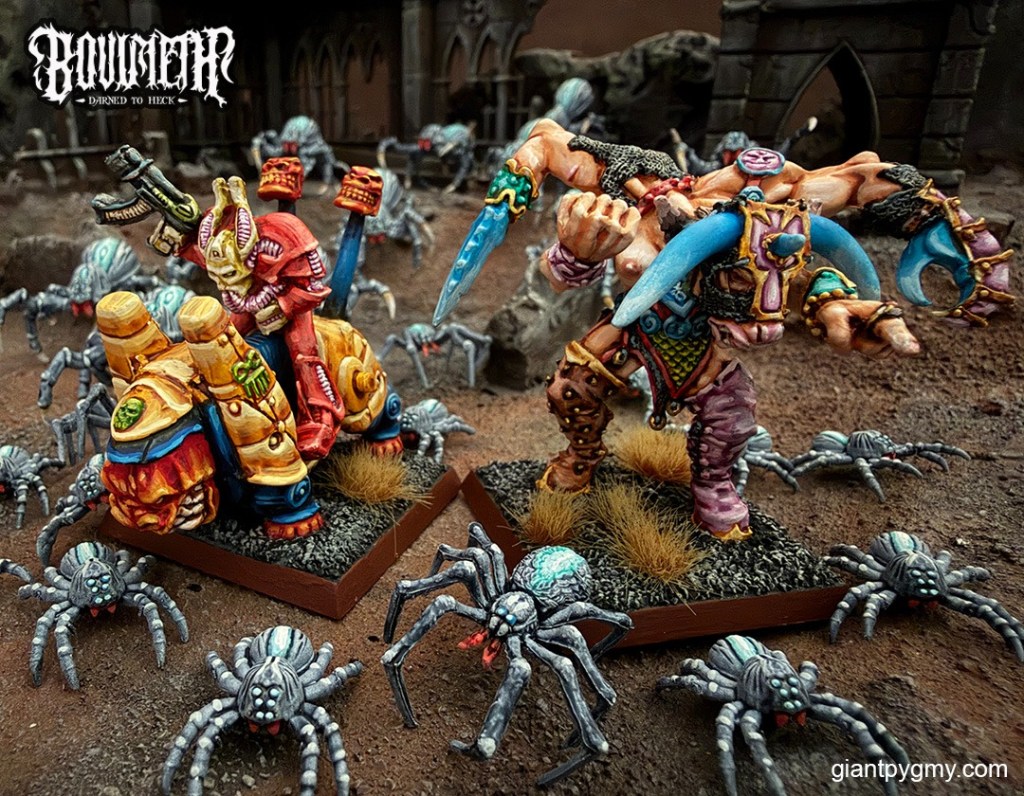 The Mark07 playlist continues to shred. My models this month flew off the table – stress-free and enjoyable. I’ve wanted to paint the skanky Keeper of Secrets for so long, there was no sitting and staring, trying to decide upon a plan of attack. Just a very quick evening of painting the model to match the Keeper in my head. The Juggernaut – Chungus Bloodfart – took some reflection to determine the right color palette, but was overall a quick task. I did add unneeded complexity to my life by painting 28 unplanned minis, but I was so inspired by the Uluru campaign that I went right to the hobby store to buy a bunch of Wargames Atlantic spider miniatures. Despite the awkwardness of assembling the large spiders, they were painter-friendly, detailed, and enjoyable to paint.