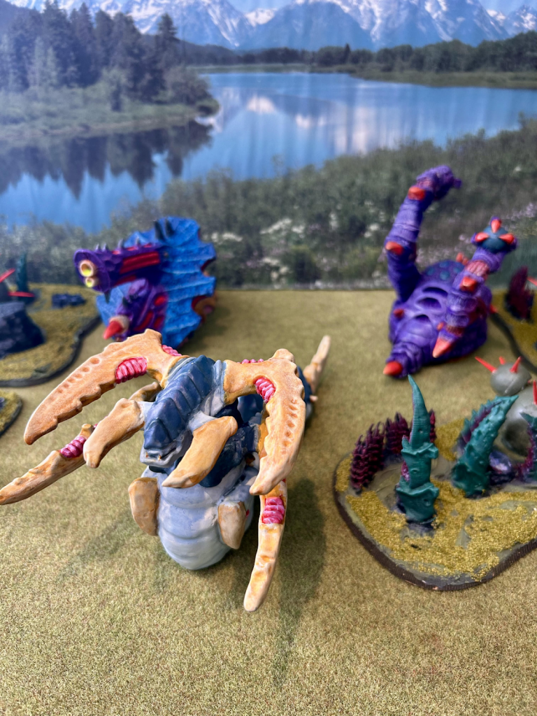 This month I decided to switch it up from the horde of smaller minis and batch painting to the very different task of painting up some of my Monstrous Creatures. I really love this side of the Tyrainds in Epic and was always a little upset that the horde didn’t get some of these bigger bugs to play with in 40K back in the 90’s. So, after getting back into the hobby, I was very pleasantly surprised to discover the Inquisitor Magazine which came out in the US back in the day and the Armourcast models that they produced alongside it. Here are two of the four made by armourcast that I am painting for the challenge, aiming for as close to the old Epic paint schemes as possible. Also in this picture is something a little rarer (as in currently one of a kind), in the form of the Trygon. This recently got rules made by one of the hardest working 2nd Edition fanatics – Philip Prentis who does great work creating new rules for this old system, and the model was scaled and printed out for me by another hard working fanatic -Tom Boyd, who under the moniker Oldhammer30k works equally as hard creating models for those that missed out first time around. Im really pleased to have painted up something that both of them worked on as I love that this old system, can through their hard work, still get new content all these years on!