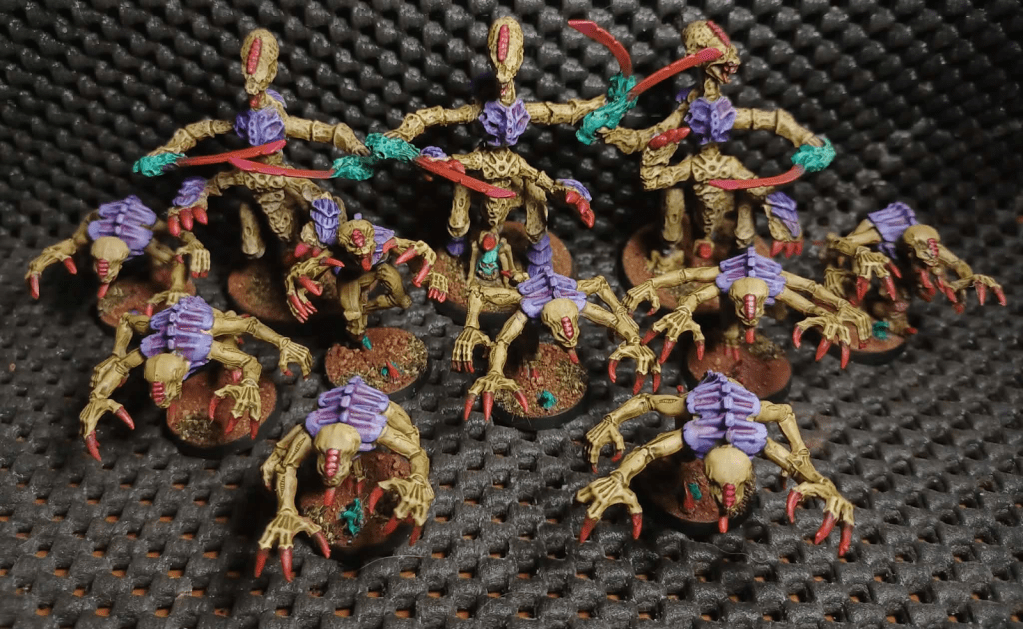 These genestealers are quite recent sculpts. I got them cheap to use some parts for repair of my ‘classic’ figures but didn’t end up using any of this 8. I’ve painted them with the same scheme as the rest of the army rather than the blue/purple traditional scheme of my genestealer cult and they came out beautifully. I did break one at the ankle and reattached with an appropriate squig for additional support.