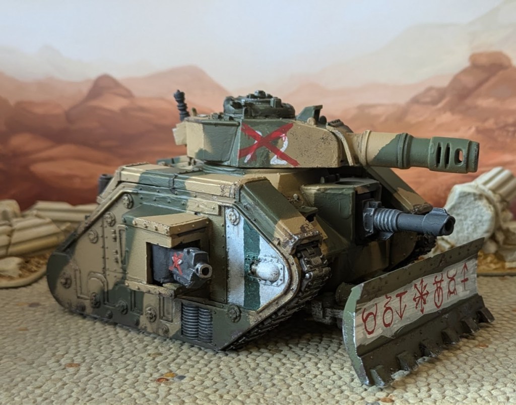 The idea behind the paint scheme was to do a pretty traditional Guard colour scheme and then “vandalise” it to represent the fact that the converts who deserted with the vehicle just went at it with some white and red paint. Thus the crossed-out unit markings and defaced aquilas. The runes of Chaos are on the dozer blade simply because it’s the largest flat surface on the model!