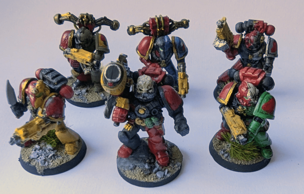 I have painted five Chaos Marines with bolters that are in a half/half scheme. It was tricky trying to work out how to show that some Marines used to belong to other Chapters before their eyes were opened to the hypocrisy of the Imperium, before they fully joined the Corsairs. Inspired by Graham McNeill’s Ultramarines books, and the Corsair Lore, I decided to paint them in a half/half scheme with their old Chapter Badges obliterated by red paint. I will put on the Corsair fist symbol when they turn up.. The “recruits” are monitored by a full-fledged Red Corsair, who happens to be toting a (liberated) Heavy Plasma Gun and is ready to vaporise any displays of cowardice or treachery.