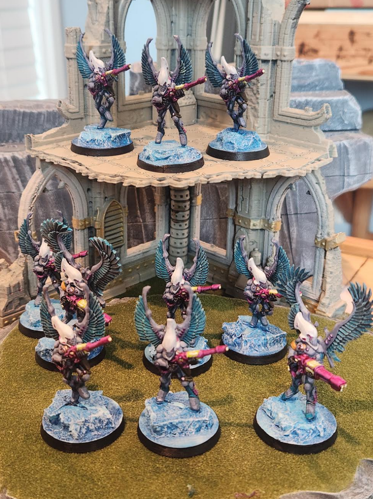 Month two came and went in a flash. Despite fewer models than last month, it fell much more stressful – spring has come and nature waits for no man with its yardwork demands! I finished my second slice of a unit of Swooping Hawks plus Exarch and then decided to add in a second, bonus unit and Exarch to wrap up all the ‘Hawks in my collection. I painted these a little differently than my original squad from a few challenges ago. Instead of doing edge highlighting, I attempted to do some down and dirty volume highlights – which I’ve never tried before – and I did a simpler drybrush on the wings. I was a bit pressed for time and the thought of edge highlighting all those feathers defeated me before I even started. I think it turned out pretty decent, even if the result is a bit more subdued than my original squad. I was glad to get some new paint on these fellows – the original models were blue and white blobs, slapped in the traditional “two thick coats” technique. Even if these guys aren’t perfect, they are leaps and bounds better than where they used to be!