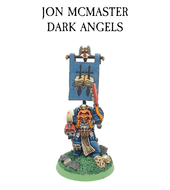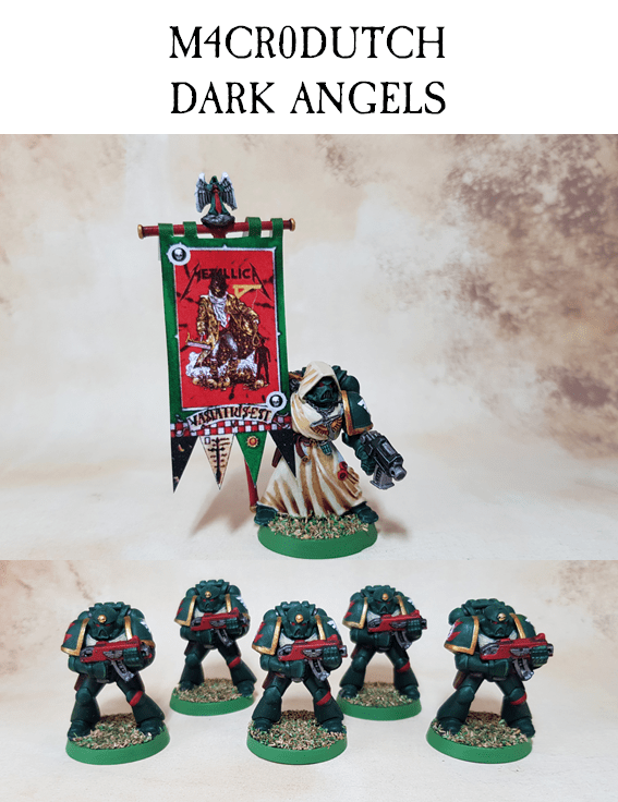 Hi folks! This month I focused on my first real Dark Angels character, who also happens to be my favourite 40K model; Brother Bethor. This figure was one of the first that I ever bought, though I immediately converted it into a veteran assault sergeant! Unwilling to pull him apart, I managed to score another one on ebay for the challenge (at twice the original price). The unofficial theme of this month’s projects was “music”, so I have given a cheeky nod to the fact that the Dark Angels and their successors call themselves The Unforgiven. The banner was made using the Push Head art for Metallica’s famous power ballad “The Unforgiven”. (ed. powerballad! Hmm, I guess you’re right. I still haven’t figured out what it is about. Not the Western film, I think.) I also painted the first five members of a Devastator squad, which I will hopefully complete next month by adding a further four heavy bolter marines and a sergeant. They won’t win any awards for painting, but I was glad to complete them, considering some of the real life challenges I have been facing this month. Thanks to all of the challengers for their support, it meant a lot to me. (ed. We are a squad! Remember! All the best and well done!)