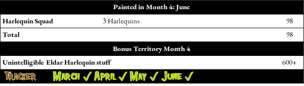 Hello all you warp-touched xenos out there! How are your prefrontal lobes? Swollen with psychic might I trust? I bet it’s from exposure to all those murderous space clowns last month. Well, what better way to celebrate the 4th month of the challenge than with unveiling the leaders of this painfully colourful troup!!! This month I managed to finish off the last of my Harlequins on foot, which consist of three more to finish the ten-strong troupe (98 points), TWO Death Jesters (250 points – it’s kind of a comedy double-act Mitchell and Webb, but with more evisceration), a Solitaire (99 points) and of course the Shadowseer Alarielle themself (203 points)! (ed. shadows, jesters and solitaurs?! I give up, I am a call it “Eldar wonk” in the bonus catergory. They are looking gorgeous as usual.) To add to this circus of death and dismemberment, a craftworld Warlock (51 points) has also been seen consorting with the Shadowseer. All up, this month I managed to paint up 701 points – those Eldar characters ain’t cheap!!! Those who have heard and witnessed these interactions between the powerful psykers have talked of the runes of war and death being apparent in the divinations. It seems that the Harlequins have been coercing the various Eldar factions into working alongside each other all along in preparation for facing threats set to appear in the near future. Mon-Keigh, both untainted and grossly corrupted, are set to threaten the future of Craftworld Alaitoc yet again and it is only with a firm united front that these upstart lesser races shall be defeated. Tune in next month folks to see what else is in store as the forces of the Eldar muster for war on an epic scale (no, not 6mm it’s still 28mm)!