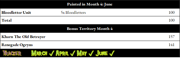 Hello everyone hope the months been good to you all. So this month Iv found it hard to find time to get anything done but as we all do I muddled on and this is the out come. Pts 100 5x bloodletters – this is the second half of a 10man unit . Enjoyed these guys these were some of my favourite models growing up so it was a joy to paint . Bonus Old man Kharn – so this guy come about because of a model I converted earlier in the challenge that was based on a wolf scout model , I posted him online an I had a few guys say he was like a young Kharn ! So my mind starts churning , what if …..being stuck on a Demon world where time and space moves differently (ed. Preach! That is exactly what it feels like in Denmark!) and the constant splits in the warp that the both men are the same person…. The old man been fighting not only the countless foes put before him but himself for a millennia stuck in time and space …. This type of thing will send a man crazy . Ha it works In my head anyway and it’s a cool way the show off my converted Kharn. Bonus Renegade Ogryns- loved doing these took me back converting metal minis. (ed. Man those are great!!!) Made these at the start of the challenge and couldn’t find the mojo to paint then but something clicked and I’m happy with the result .
