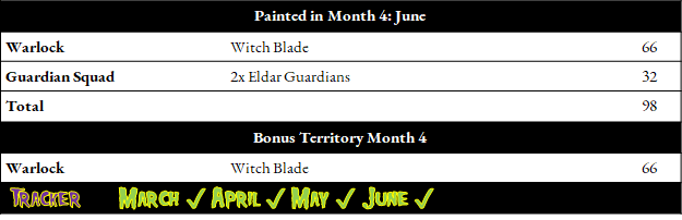 Dear 2nd. ed fans, this month I got a couple of warlocks and two guardians done for my army. After a recent game of 2nd ed 2 warlocks came in very handy so I decided to paint up 2 instead of one, so one is the original pledge and one is a bonus. I was once again disappointed not to finish the whole guardian squad…but at least I got a couple done. (ed. I think you did really well!!! I love the rolling total below – I will have to implement that somehow in the future) The rest are sure to follow soon now! Therefore for June I have completed the models seen in the scheme below. Interestingly the heavy plasma gun was not on my original pledge so will count as a bonus entry! I just enjoyed painting the last guardian heavy weapon team (the crew models are great) and so I just found myself doing another one. Sometimes you just have to follow your heart!