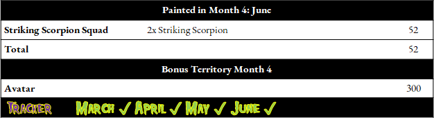Hi! Interesting month this one! I had originally intended to finish off the last squads in the army – 2 more Striking Scorpions and 4 Swooping Hawks, as this would have left me with only two characters to paint in two months. However, I got slightly distracted… Having got everything ready to prime I spotted the Avatar model I picked up a while ago but had put off for ages because it’s an awesome model and I really wasn’t sure I could do it justice. As I’d built it with the sword arm removable I decided ‘why not prime it and I can always try the arm as a test’. It went surprisingly well – I was really happy with how the glowing effect came out and how dark a red I managed to get the armour (roughly following Mike McVey’s recipe from the 1990s Eavy Metal 40k painting guide, but with modern GW paints). This inspired me so much that I couldn’t stop painting it – 3 weeks went by but I am really happy with how its turned out!!!! (ed. Oh boy oh boy! That is a beast! You painting is soooo crisp and good!) Only minor problem is that it wasn’t in the original army list and I now had 1 week remaining to paint something that was!!! In the end I just about finished off the 2 Striking Scorpions – there are still a couple of small details to paint but they are done enough to put on the tabletop if required!!! This does now mean next month I will have to paint the 4 Swooping Hawks and at least make a start on either the farseer or Baharroth. As I’ve not managed to find a base I’m happy with for Baharroth it might be the farseer first! Anyway, this month’s completed models are: