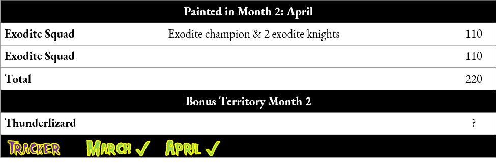 I began April on a real high. I had completed a bunch of characters in March and really enjoyed both the painting and the result. I decided to challenge myself, painting vehicles which is something I haven’t done often, and attempting to paint rust which is something I haven’t done ever. I started with the Dreadnought, for the deathskull clan so meant to be a hodgepodge of random coloured panels. Overall, while ok, the Dreadnought did not go to plan, I worked and reworked it – and while it’s OK, I was never quite as satisfied as I wanted to be. (ed. I think you’re being a bit hard on yoursefl – it looks splendid in my opinion!) The warbuggy was far better – I think I really captured the look I was after on it. For the Deathskull squad I was almost running on auto. I was mentally exhausted after the two vehicles (ed. Ugh! I know this feeling!) but still had a lot of time to work on stuff. I like the result but I didn’t put my heart and soul into them like I had done with last months characters or this months vehicles. I finished early and painted a few random Dungeons & Dragons figures in order to give myself a mental breather. I don’t dislike this months results but I really wanted just a bit more. I will return next month with new vigour and vitality (ed. that is the spirit my man!). Hoping for slightly better results.