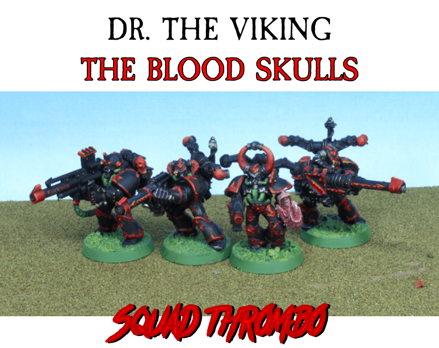 So the last official month is over and what did I do – well the last squad of my armylist. Nearly. The squad originally included a heavy bolter. But the left arm of the bolter was missing, and I didn’t have a really good idea to substitute. I actually did find a missile launcher model also, and wanted to add this, but it never happened. This squad is less of a fixed unit in the army. It is common for the Blood Skulls to mix members of Squad Thrombo into other units to serve as heavy weapon back up. However, when they do go out as a single unit they are there to hunt vehicles for sure. Now, even if this squad is really small, it actually was the hardest one to paint I think. I am just fatigued, having painted Blood Skulls for a year now. It is more like a mechanical thing than a pleasure at this state. Haha! I have a pretty good idea where to start and how to finish. The range of motion in between, however, can be excruciating when there are sooo many other objects vying for my attention. 😛 The Blood Skulls will meet their natural end when I run out of Blood Letter Glaze. In August I really hope to finish a major baddie for my army.