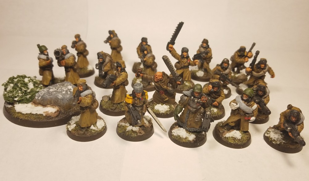 The lieutenant is based on one of the classic commissars with a head swap (cadian command squad head) and hat/collar made from green stuff. I had a moment where I started to 2nd guess Lieutenant Sokoloff’s appearance midway through painting him, I wasn’t sure if the head swap and green stuff really sold the model as a Valhallan. Fortunately, he really came together once I cleaned up his facial scar and got the washes on him. After that he looked at home alongside the rest of his squad.