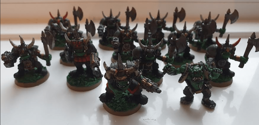True to Da Plan, Warboss Blackaxe ‘az dee-sided to push doze Skarboyz inta da front line first as dey seem ded ‘ard. Also, dey just got pistols an’ axes so dey need moar time ta run up to da enemy and smash ‘em in DA FACE!! I fink he was lookin’ fer more boyz ta turn up as extra, but dey is still lurkin’ somewhere and being VERY un-orky. Da good newz iz dat dey have two Nobz ta sort ‘em out and shout louda. I rekon we kan get betta pick-chaz next time..