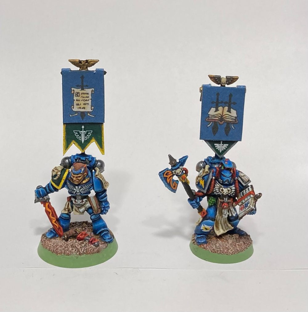 Codicer Astrovel and Lexicanum Daskhoreal are my first “slice” for season 3 and are helping me kick things off in a spectacular, if slightly blue-tinged fashion. Ever since seeing pictures of the three lower ranks of librarians for a chapter in early 90’s issues of White Dwarf and 2nd edition codexes, I have always wanted to replicate that selection of models for my army. Over the first two seasons of the challenge I have learned that one of the most fun elements of this project is finally fulfilling all those long desired plans for armies of old. Along with their etheric value, these two librarians will also make their presence felt on the battlefield; adding more powers and psychic energy to each turn when used together or offering me a range of different point value plug and play psykers for games where I take just one. Codicer Astrovel is wearing the colors of the 4th company to match the squads I painted in season 1, and Lexicanum Daskhorael is a leader for the 6th company squads from the previous season. Tying things together both visually and thematically with the space marine insignia and colors as interpreted by my long steeping in the 40K universe is another bell this challenge helps me ring in the category of huge hobby enjoyment. Follow along as I find my joy with my Dark Angels army over at 1st Legion Chronicles and best of luck to all my fellow participants and the good Dr The Viking.