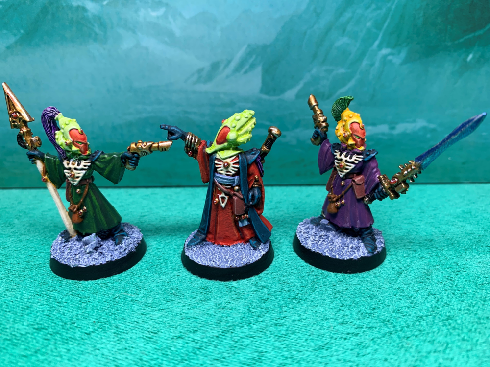 Anyway, one of the hurdles of the three was that I thought I’d try practicing some two-brush blending on the robes, only to realize that I probably didn’t have the time to make it really pop, so opted instead for my typical basic layering and edge highlighting. The Warlock with the green robes was the toughest as I first tried a Snot Green base, then a Woodland Green one, but they both turned out to be too thin (even over a white primer!). Finally I went with a Dark Angels Green, with Sunburst Yellow then Skull White mixed in for the highlights. The helmets of the green Warlock and the Farseer were Bilious Green with Skull White added in for the highlights.