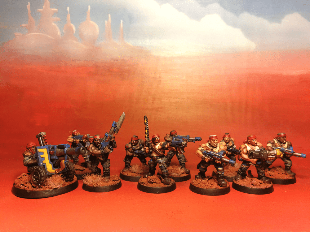 When it comes to models and paint schemes, some of you may have noticed that this month’s entry features models from THREE different regiment ranges; Catachan, Cadian and even a Tallarn autocannon gunner! I actually wanted to test my scheme with different models and am incredibly pleased how easily they translate to each unit and so hope in the future to perhaps add more to the army. Also, the primaris psyker is in fact a Rogue Trader model that was a gift from a friend I’ve been gaming with since the late 90s so I was very pleased to finally add him after sourcing some arms and doing a bit of conversion work.