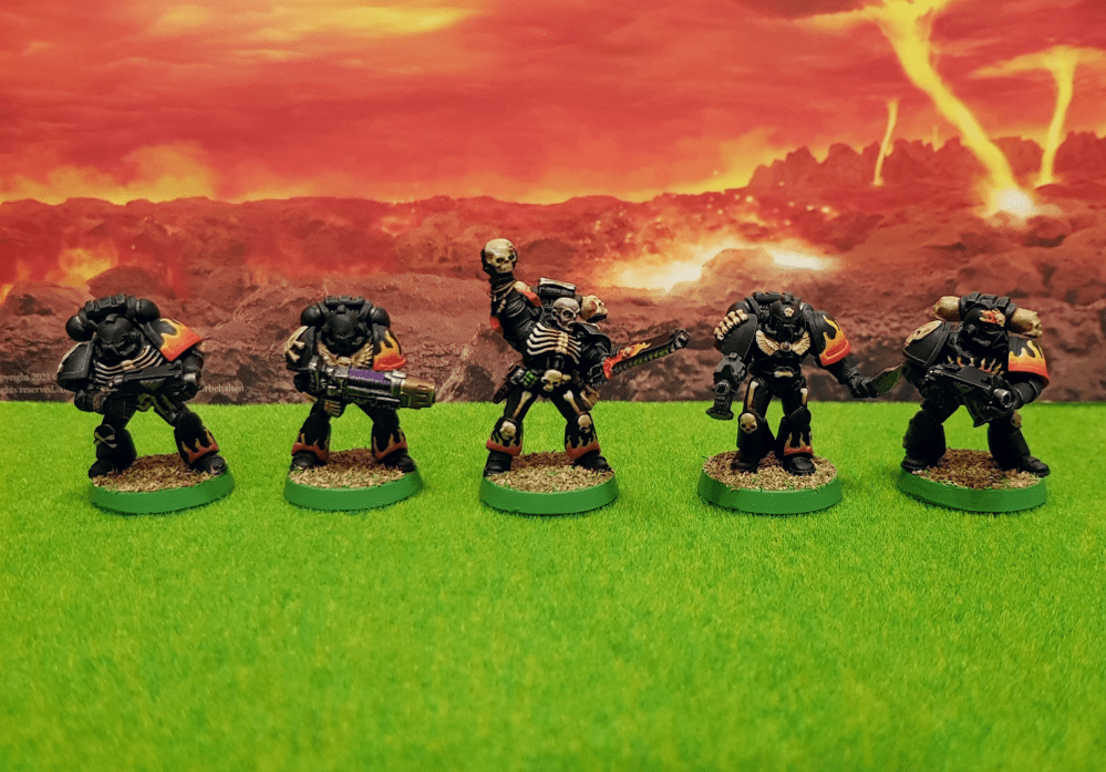 The 3 tactical marines each have something unique relative to other models painted so far. #1 has an honour mark (blood drop on white field) on his left kneecap as seen on some early 90’s rogue trader blood angels, #2 has red shoulder trim and freehand RT era chapter symbol, #3 is wielding his bolter one handed. Nothing especially flamboyant, but it makes each model unique to me.
