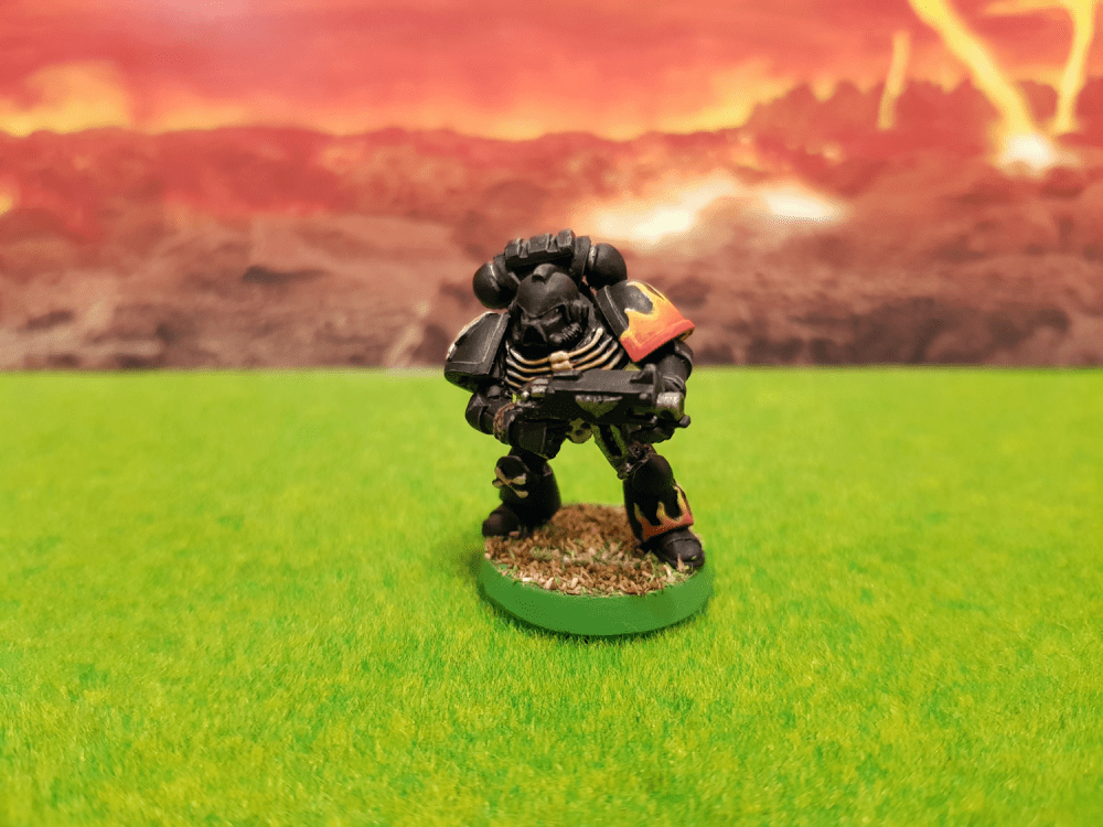 The squad leader wears MKVI and is one of the lesser spotted models from the period, having markings on his leg and helmet. The heavy weapon marine is equipped with a missile launcher, styled of the ‘very yellow’ blood angels art from the Codex. Specifically the white and blue checks and flame wrapped nozzle in a similar style to the devastator completed in January.