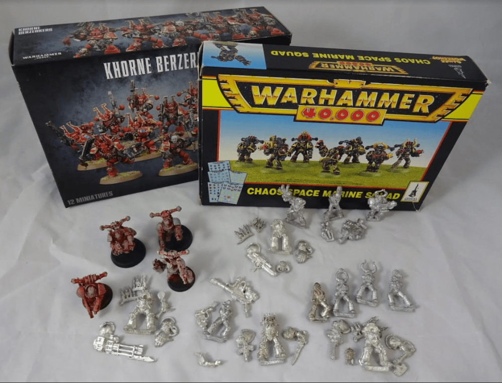 When I came into the hobby in 1998, it was due to Gorkamorka – I never actually played 2nd edition back then. For me 40K as a game only started with 3rd edition, and I fell for Chaos with the release of the multipart Khorne Berserkers (which are still in production!) in 1999. I also fell in love with the metal Chaos Terminators of the time, and the rest is the proverbial history. Fast forward 22 years, and I am still in love with Chaos (and Orks), despite never having had big painted armies for either. I am more of a collector, builder and painter – in that order – and never played a lot. Still: nostalgia has hit me pretty hard earlier this year, and I finally want to give 2nd edition a go! This challenge seems to be a great opportunity to keep me going for a while, and we will see how it ends. My project is themed around a Khornate warband during the First War of Armageddon, with the goal of using mostly 2nd edition models only. I say „mostly“ because I adore the 1999 Berserkers – a phenomenal kit for its time – and want to use those despite them only coming out during early 3rd edition. I am also no purist when it comes to conversion parts or bases – hell, later on for Daemons I want to use the current plastics, since they are much closer to the original RT style than the metals of 2nd edition, and I simply like them much better! In the end I want the models to look good to me, so I am willing to compromise in terms of „original models“. None of the models used for this project is younger than 22 years though, so either from 1999 or older. My Chaos Lord is the oldest of the bunch by far, being from 1991 (i.e. RT days). The warband is comprised of 20 models, and after some juggling of wargear I managed to get the points total to be divisible by 8 – which is Khornes sacred number! With some bonus along the way I plan to finish with a model count of the same type. Blood for the Blood God! As you can see on the picture, I just started to put some of my old Berserkers on new 32mm bases, and one months worth of models is still in the box: as I mentioned earlier, the current Khorne Berserker kit is (except for the bases) the very same as back in 1999. The Terminators will get 40mm round bases, all other models will be on 32mm ones. Any Daemons added will be on round or even oval bases – I do not like square bases in 40K. WHF though… a topic for another day! My main goal is to make it to the finish line and have some fun along the way. I also aquired some old Space Wolves recently, so themed battles could happen after this project and possibly the next one? Last, but by no means least: I am on a German forum with a bunch of 2nd edition enthusiasts. Any interested German reader can visit us over on Tabletopwelt at: https://www.tabletopwelt.de/index.php?/topic/166324-die-beste-edition-aller-zeiten-ii/ Maybe you find somebody to play 2nd edition with near your place, or you just join for the banter and hobby fun!